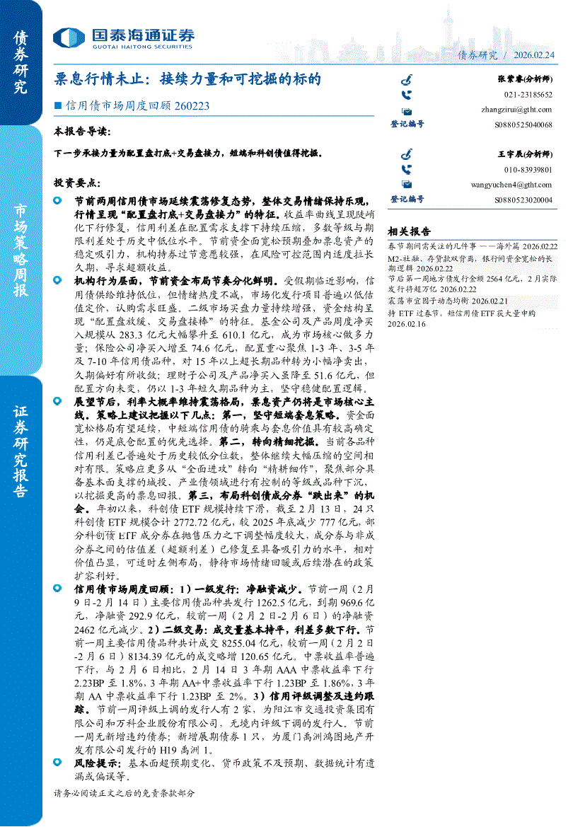 国泰海通证券-信用债市场周度回顾:票息行情未止,接续力量和可挖掘的标的-260224