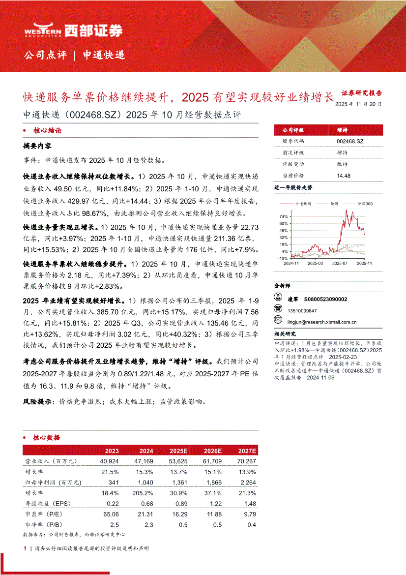 西部证券-申通快递-002468-2025年10月经营数据点评:快递服务单票价格继续提升,2025有望实现较好业绩增长-251120