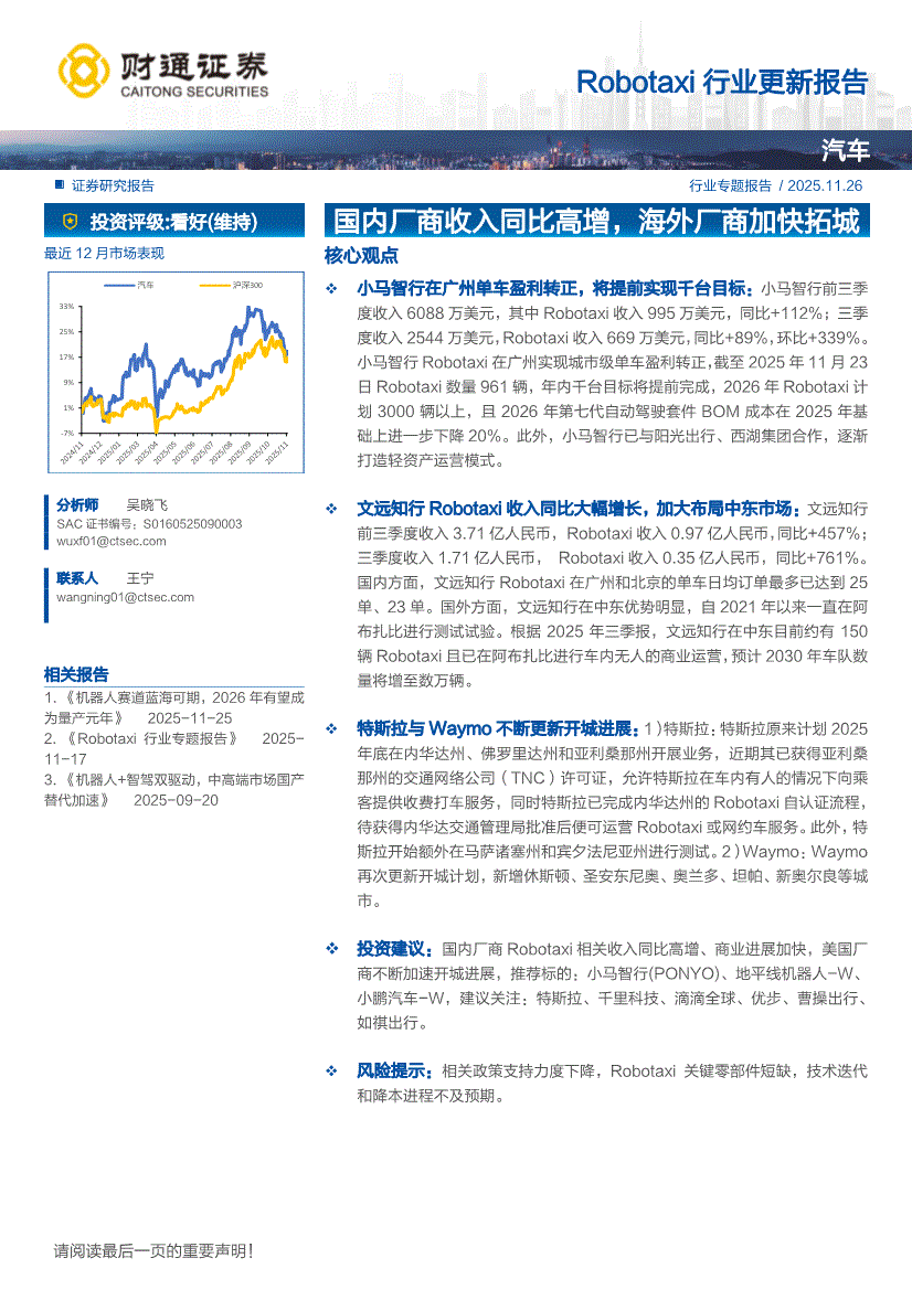 汽车行业:财通证券-Robotaxi行业更新报告:国内厂商收入同比高增,海外厂商加快拓城-251126