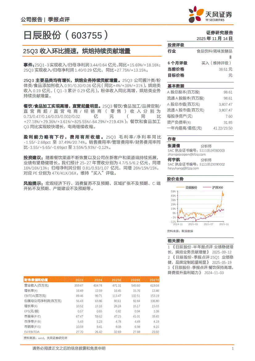 日辰股份:天风证券-日辰股份-603755-25Q3收入环比提速,烘焙持续贡献增量-251114