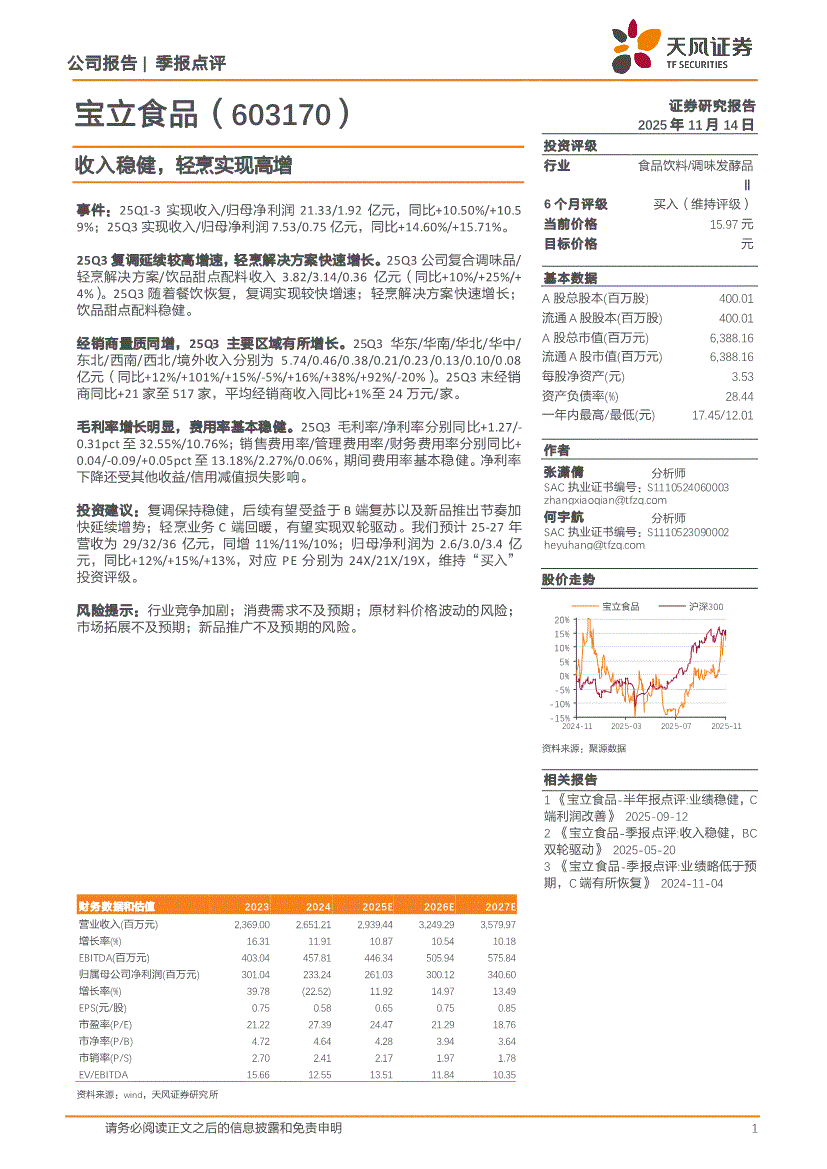 宝立食品:天风证券-宝立食品-603170-收入稳健,轻烹实现高增-251114
