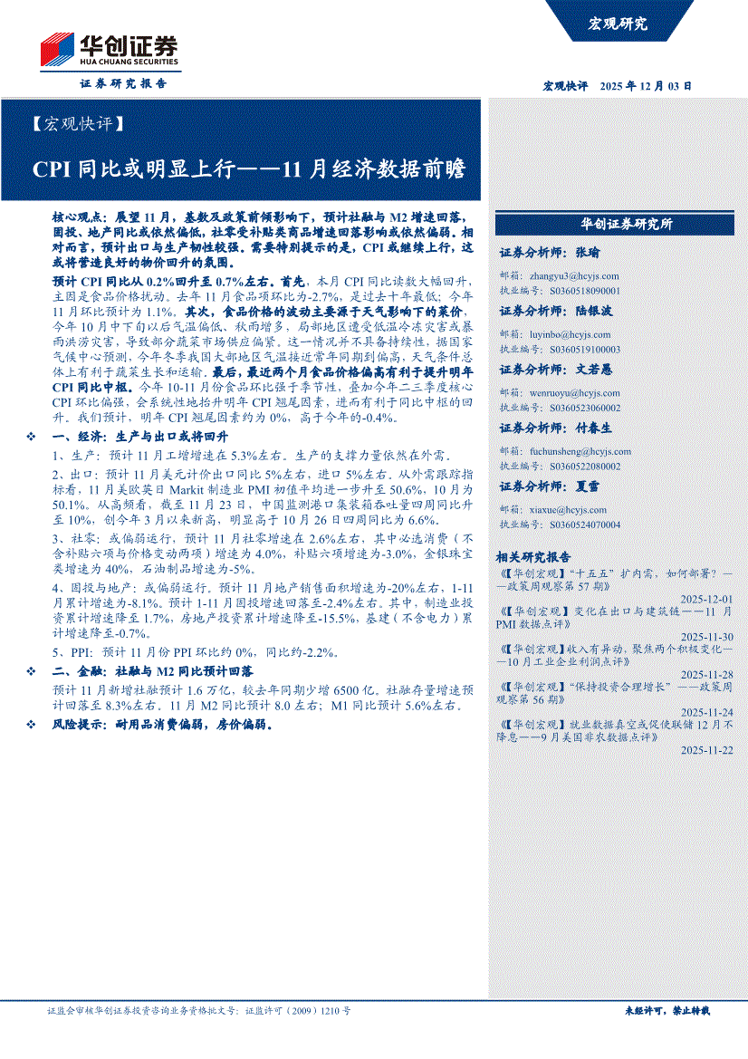 华创证券-【宏观快评】11月经济数据前瞻:CPI同比或明显上行-251203