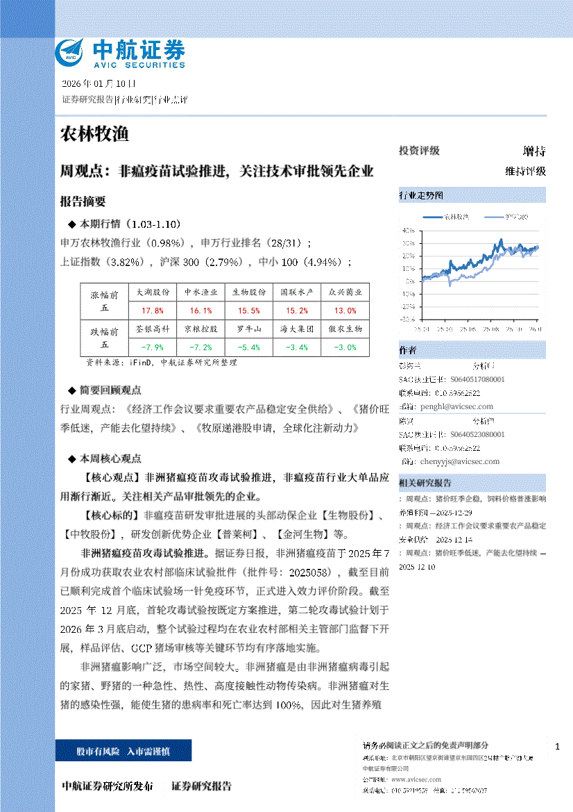 农林牧渔行业:中航证券-农林牧渔行业周观点:非瘟疫苗试验推进,关注技术审批领先企业-260110