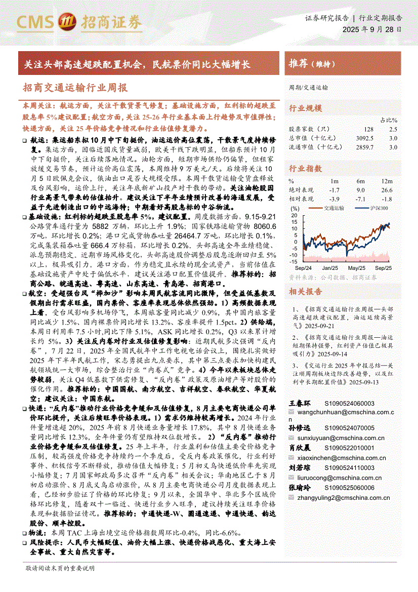 交通运输行业:招商证券-交通运输行业周报:关注头部高速超跌配置机会,民航票价同比大幅增长-250928