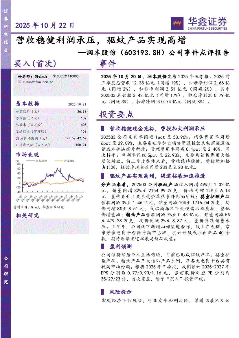 润本股份:华鑫证券-润本股份-603193-公司事件点评报告:营收稳健利润承压,驱蚊产品实现高增-251022