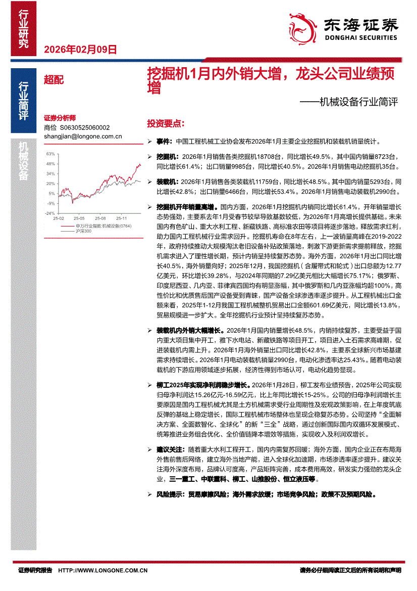 机械设备行业:东海证券-机械设备行业简评:挖掘机1月内外销大增,龙头公司业绩预增-260209