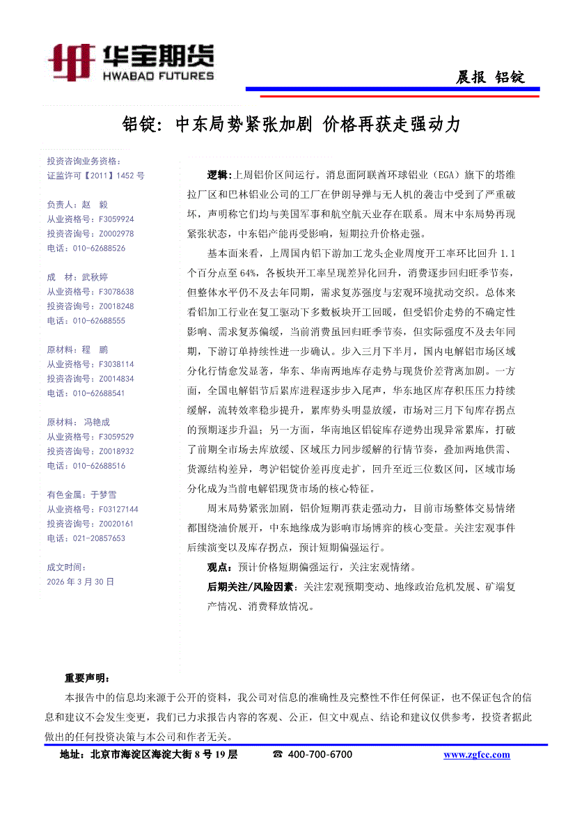 华宝期货-铝锭晨报:中东局势紧张加剧,价格再获走强动力-260330