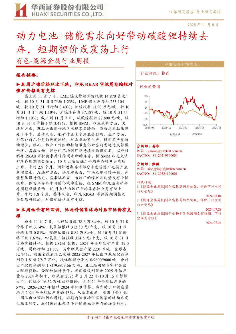 有色~能源金属行业:华西证券-有色~能源金属行业周报:动力电池+储能需求向好带动碳酸锂持续去库,短期锂价或震荡上行-251108