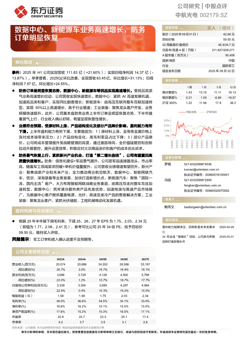中航光电:东方证券-中航光电-002179-数据中心、新能源车业务高速增长,防务订单明显恢复-250902