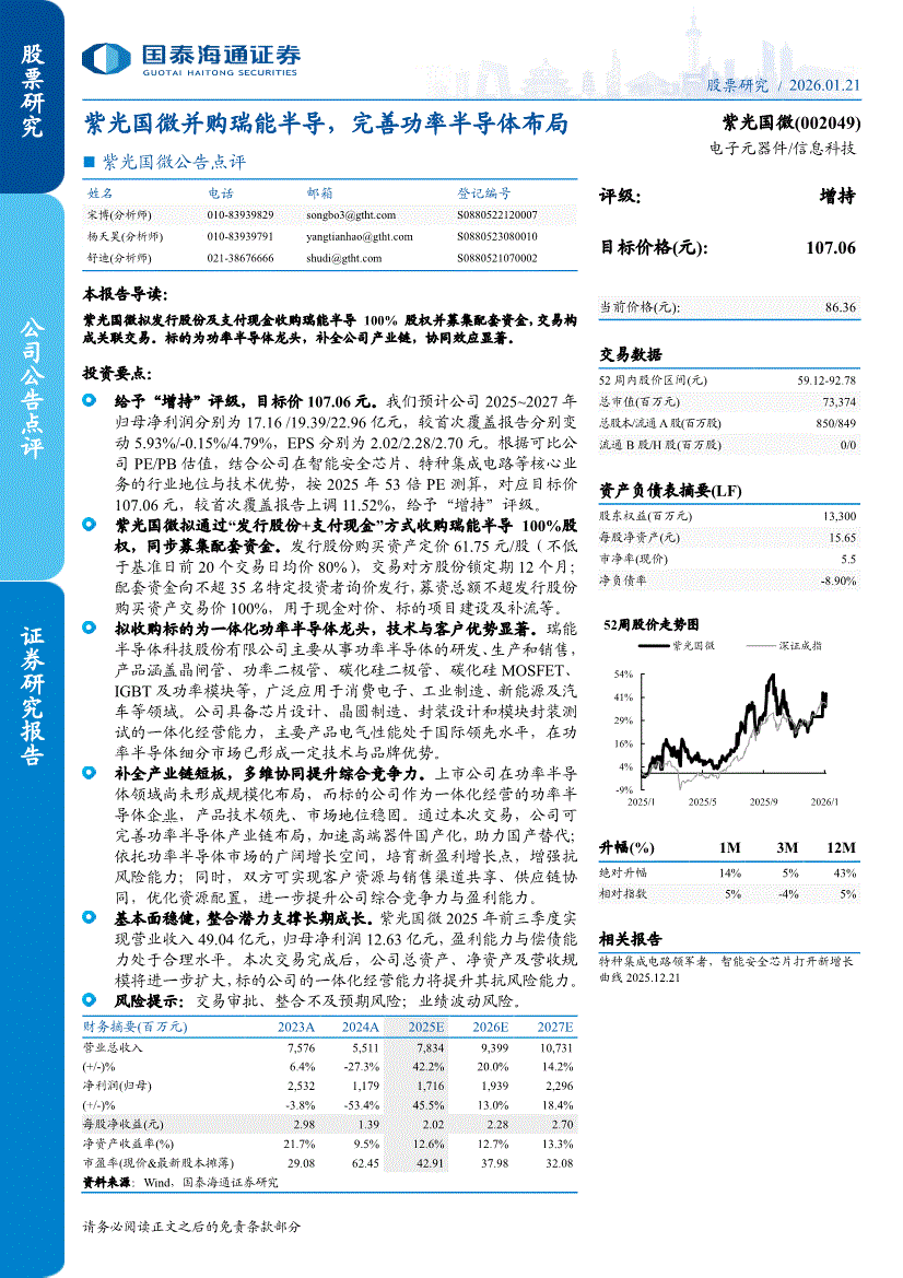 紫光国微:国泰海通证券-紫光国微-002049-公告点评:紫光国微并购瑞能半导,完善功率半导体布局-260121