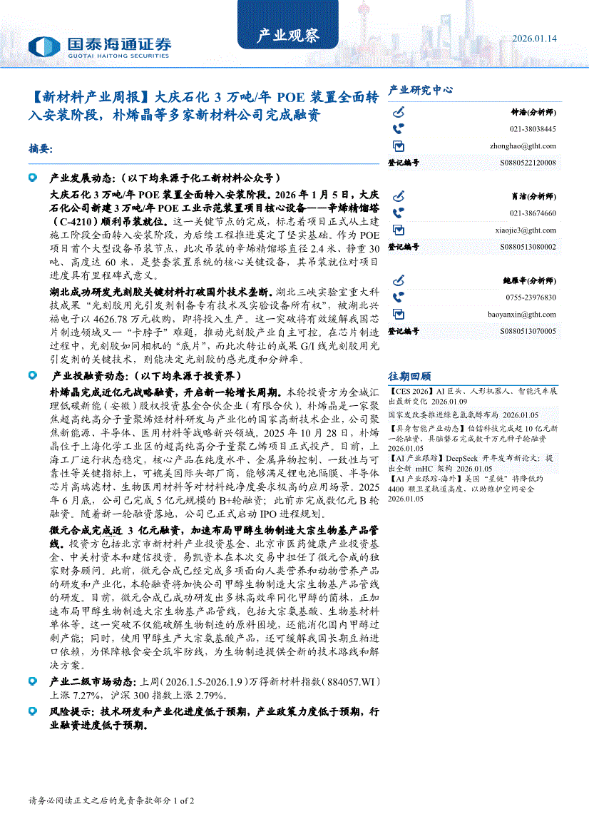国泰海通证券-产业观察:【新材料产业周报】大庆石化3万吨/年POE装置全面转入安装阶段,朴烯晶等多家新材料公司完成融资-260114
