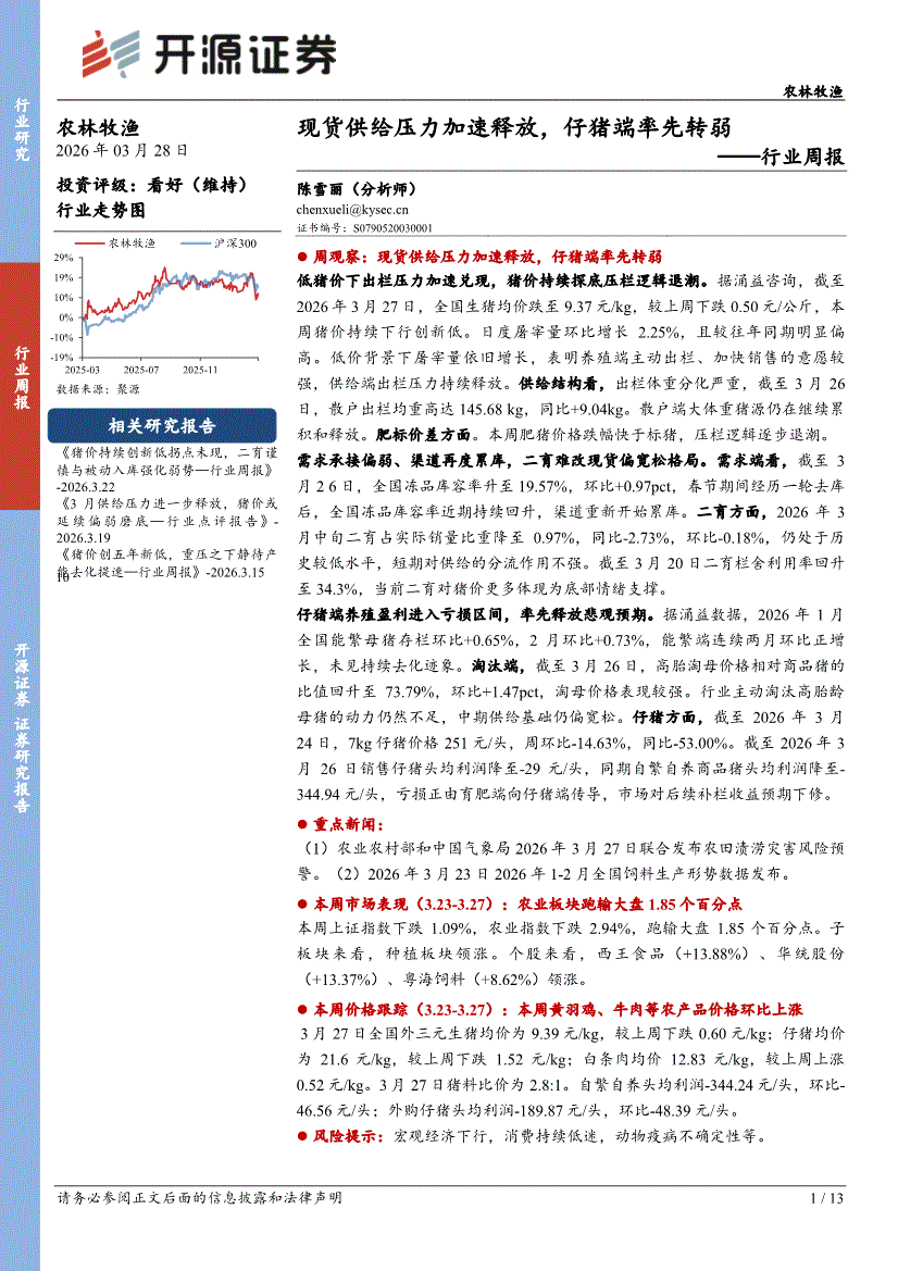 农林牧渔行业:开源证券-农林牧渔行业周报:现货供给压力加速释放,仔猪端率先转弱-260328