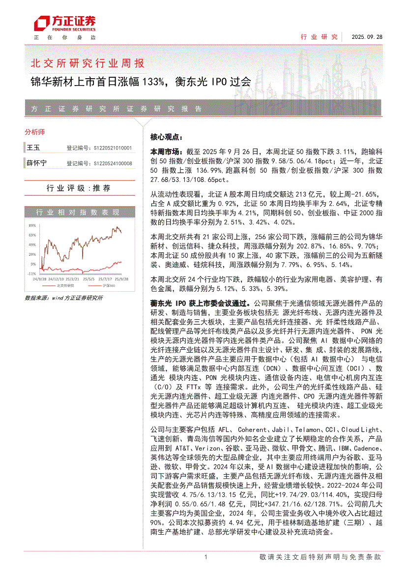 方正证券-北交所研究行业周报:锦华新材上市首日涨幅133%,衡东光IPO过会-250928