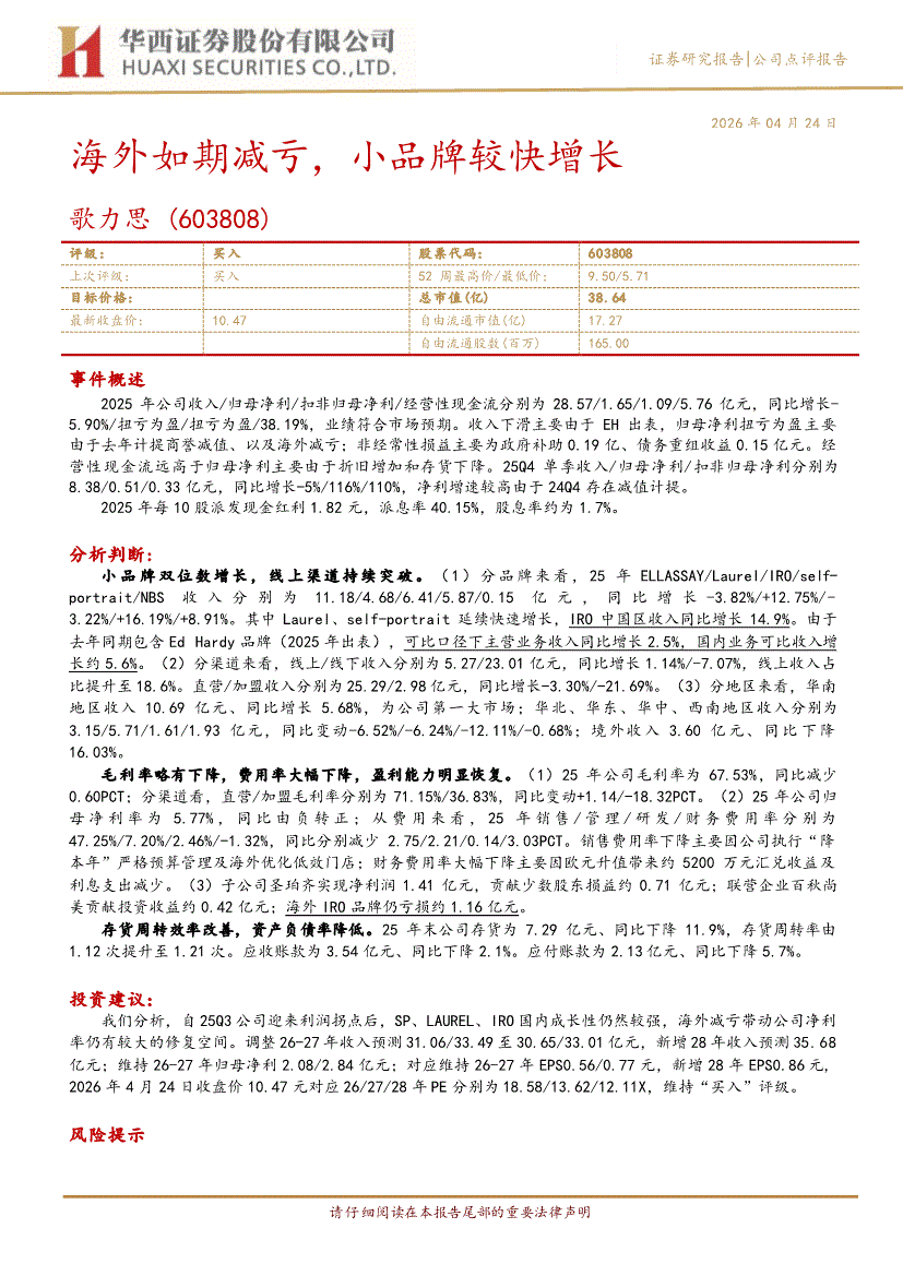 歌力思:华西证券-歌力思-603808-海外如期减亏,小品牌较快增长-260424