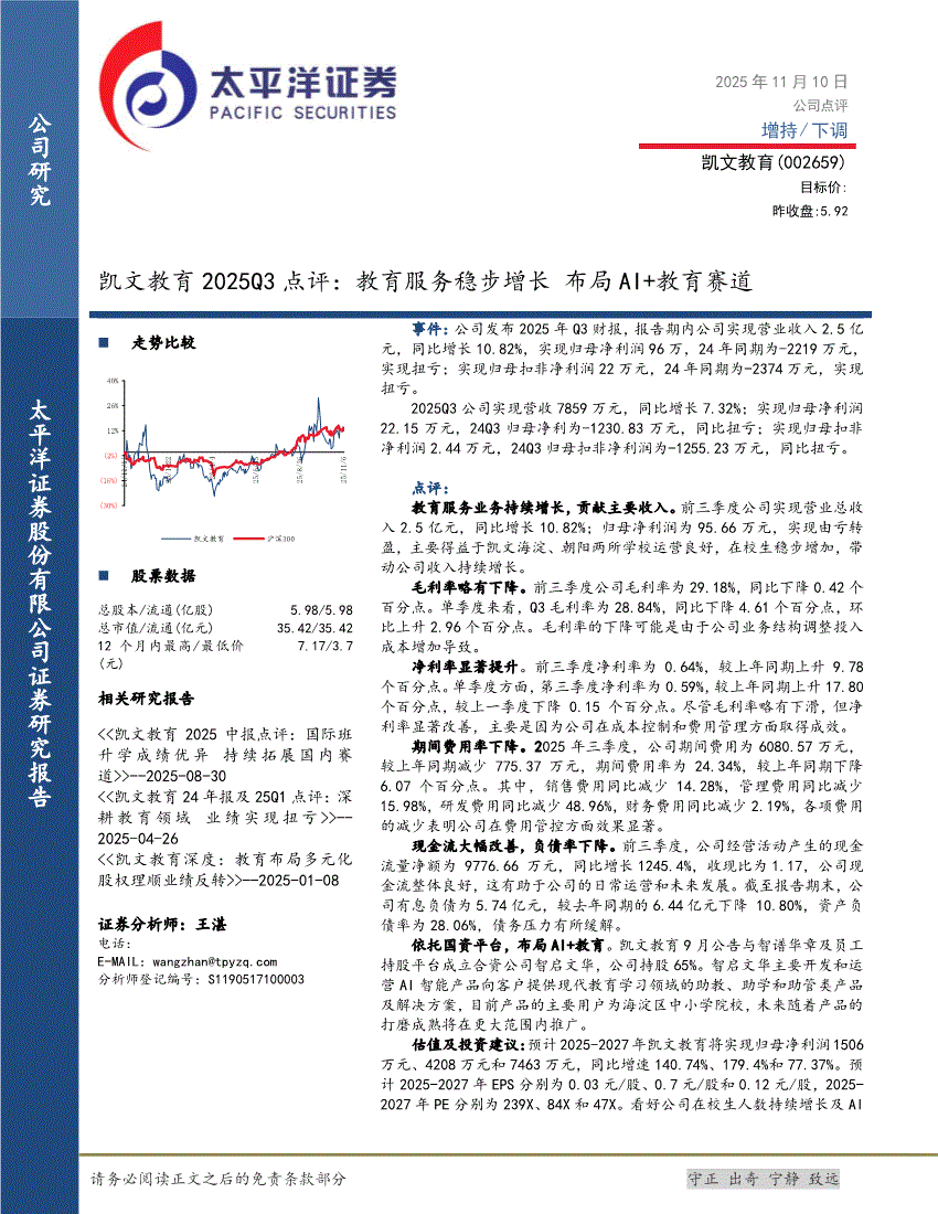 凯文教育:太平洋证券-凯文教育-002659-2025Q3点评:教育服务稳步增长,布局AI+教育赛道-251110
