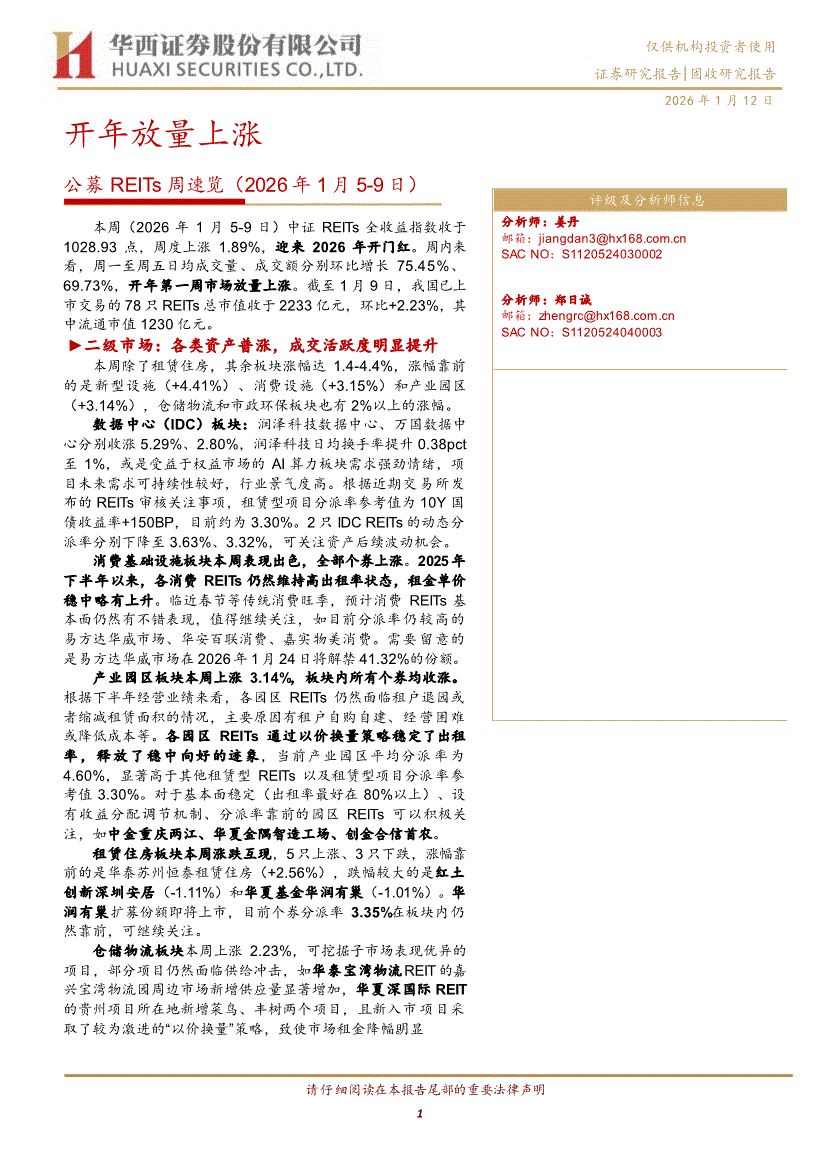 华西证券-公募REITs周速览(2026年1月5~9日):开年放量上涨-260112
