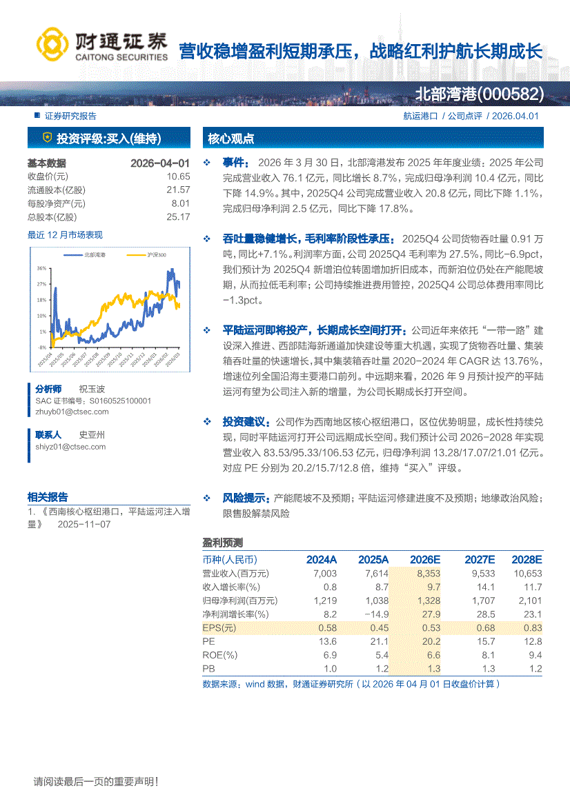 北部湾港:财通证券-北部湾港-000582-营收稳增盈利短期承压,战略红利护航长期成长-260401