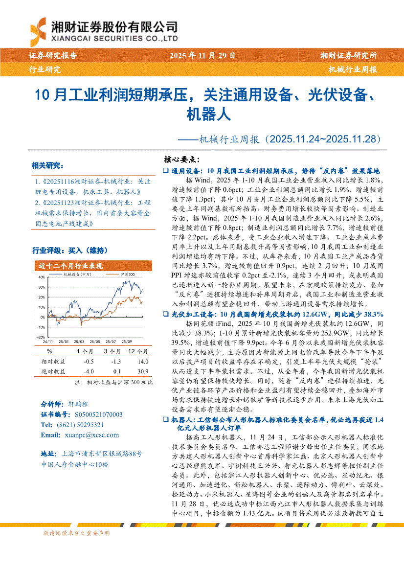 机械行业:湘财证券-机械行业周报:10月工业利润短期承压,关注通用设备、光伏设备、机器人-251129