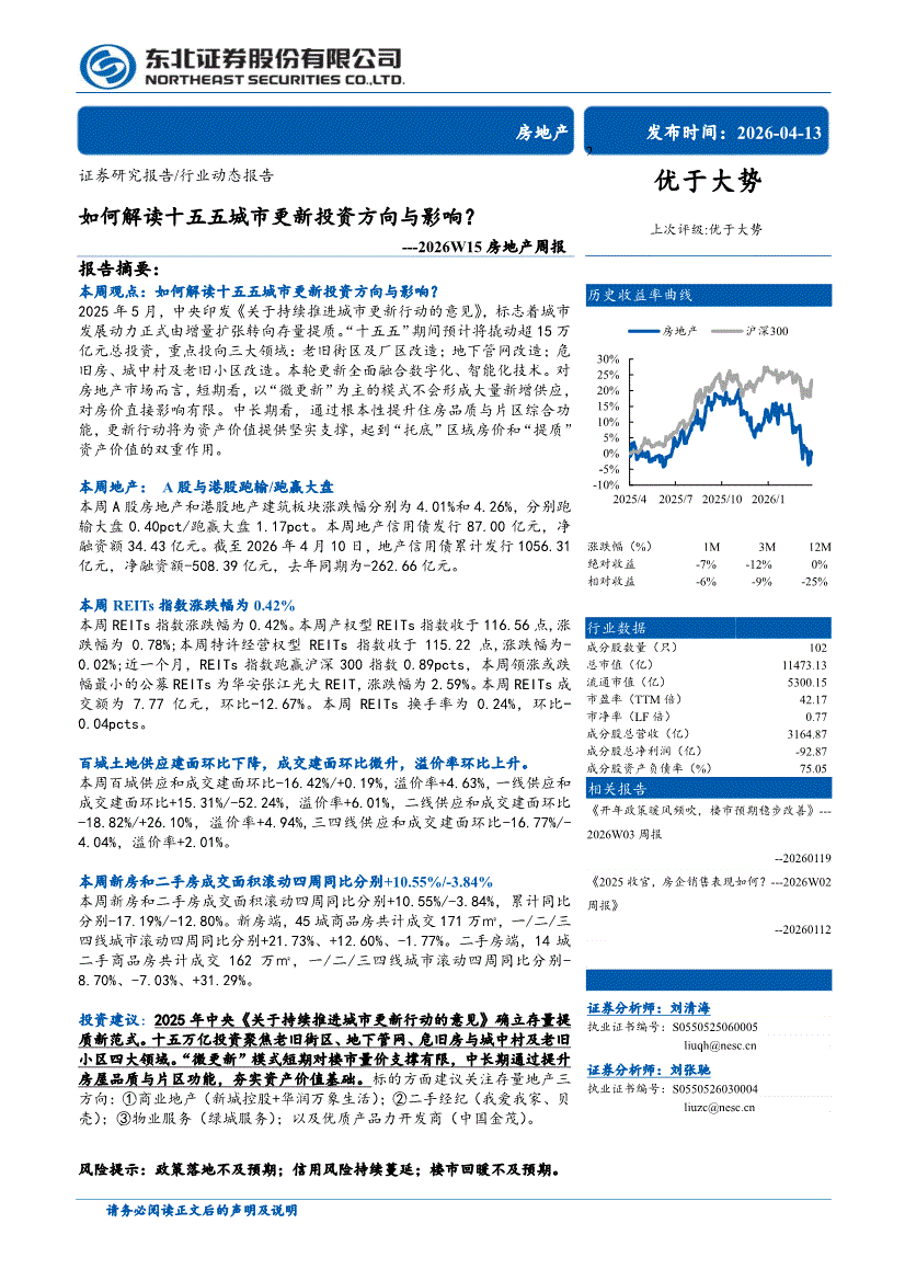 房地产行业:东北证券-2026W15房地产行业周报:如何解读十五五城市更新投资方向与影响?-260413