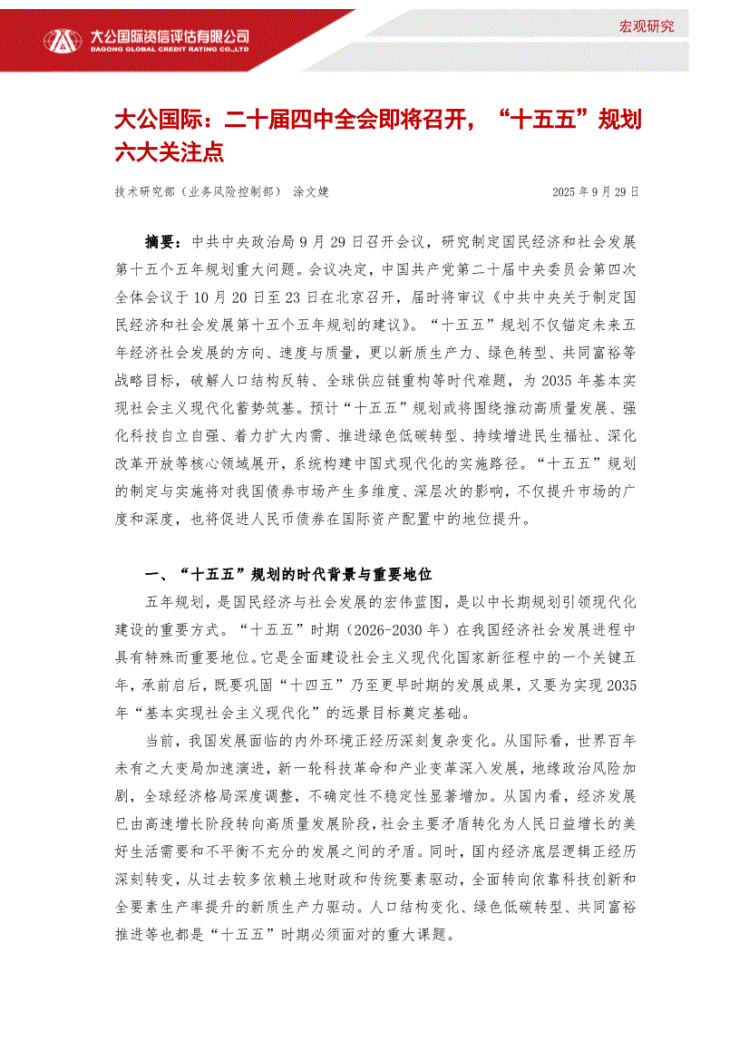 大公国际-二十届四中全会即将召开,“十五五”规划六大关注点-250929