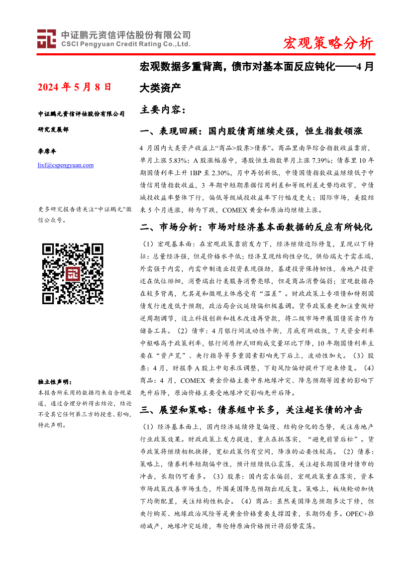中证鹏元资信评估股份有限公司-4月大类资产:宏观数据多重背离,债市对基本面反应钝化-240508