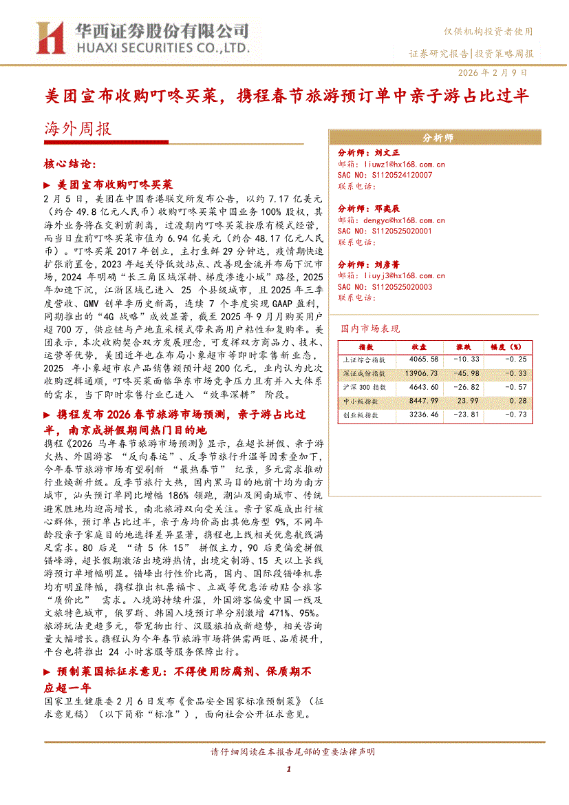 华西证券-海外周报:美团宣布收购叮咚买菜,携程春节旅游预订单中亲子游占比过半-260209