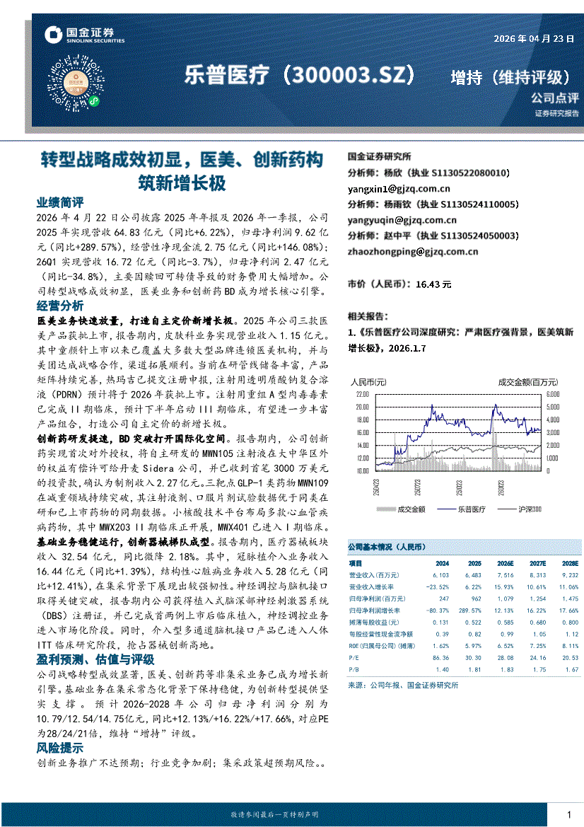 乐普医疗:国金证券-乐普医疗-300003-转型战略成效初显,医美、创新药构筑新增长极-260423