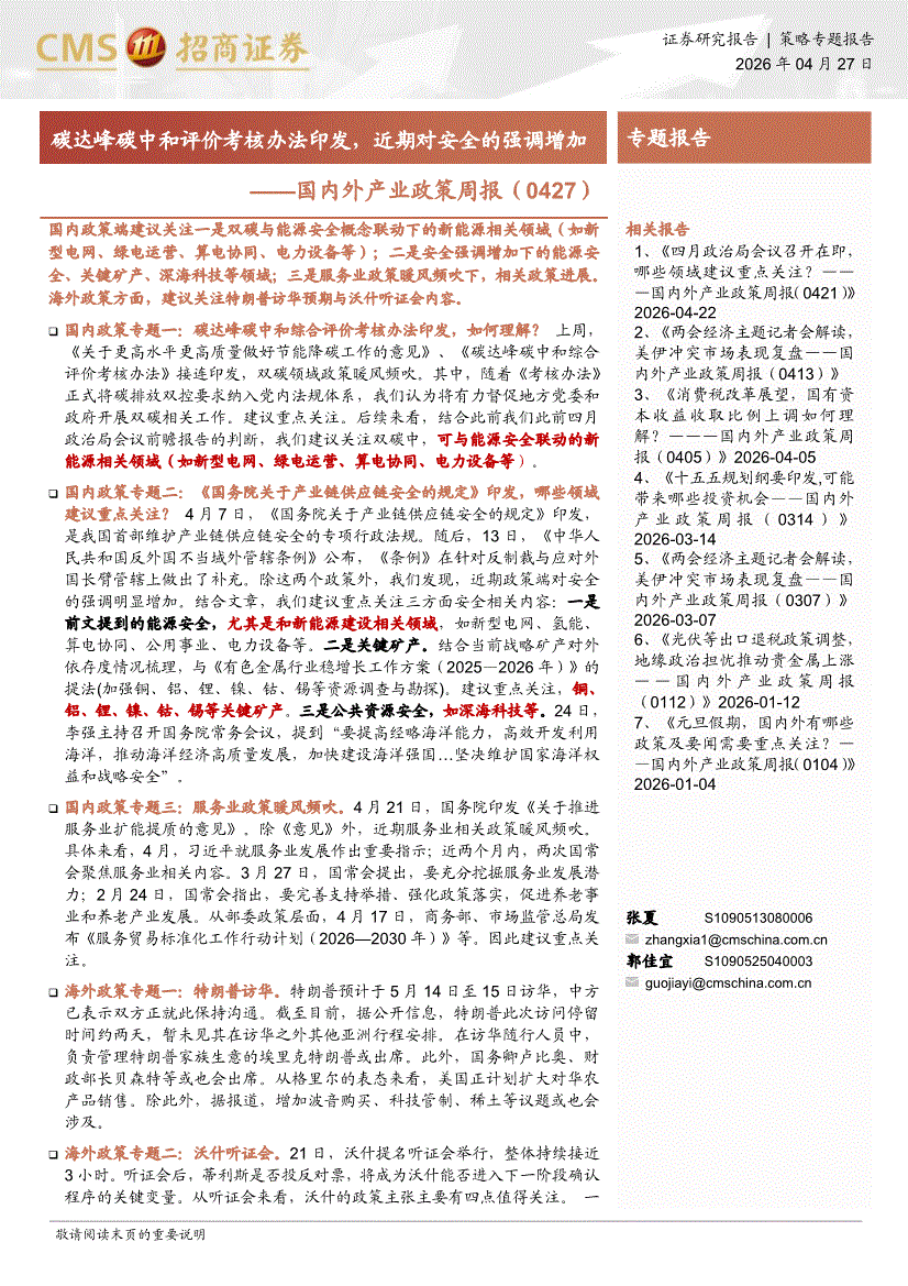 招商证券-国内外产业政策周报:碳达峰碳中和评价考核办法印发,近期对安全的强调增加-260427