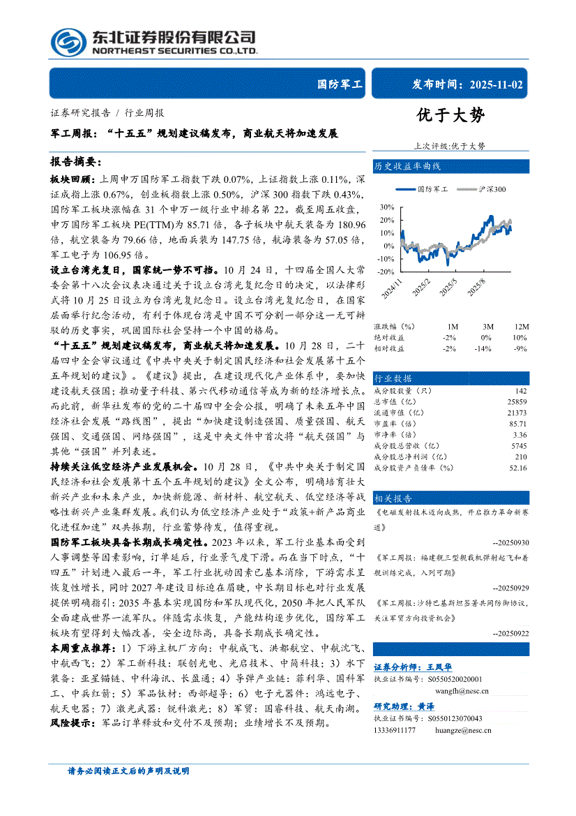 国防军工行业:东北证券-军工行业周报:“十五五”规划建议稿发布,商业航天将加速发展-251102