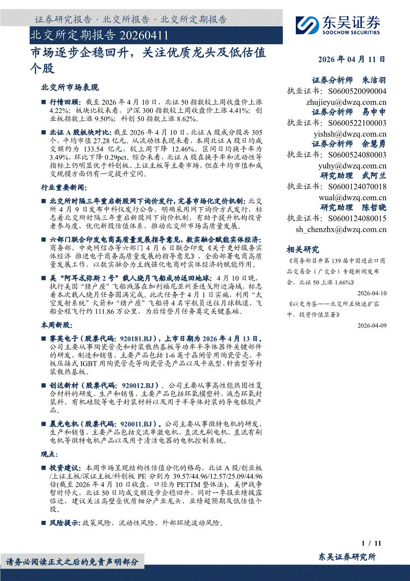 东吴证券-北交所定期报告:市场逐步企稳回升,关注优质龙头及低估值个股-260411