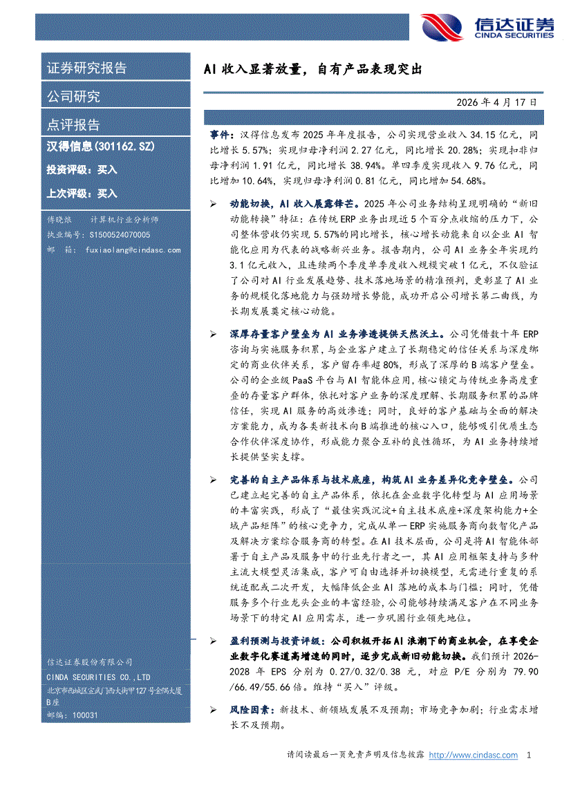 汉得信息:信达证券-汉得信息-300170-AI收入显著放量,自有产品表现突出-260417