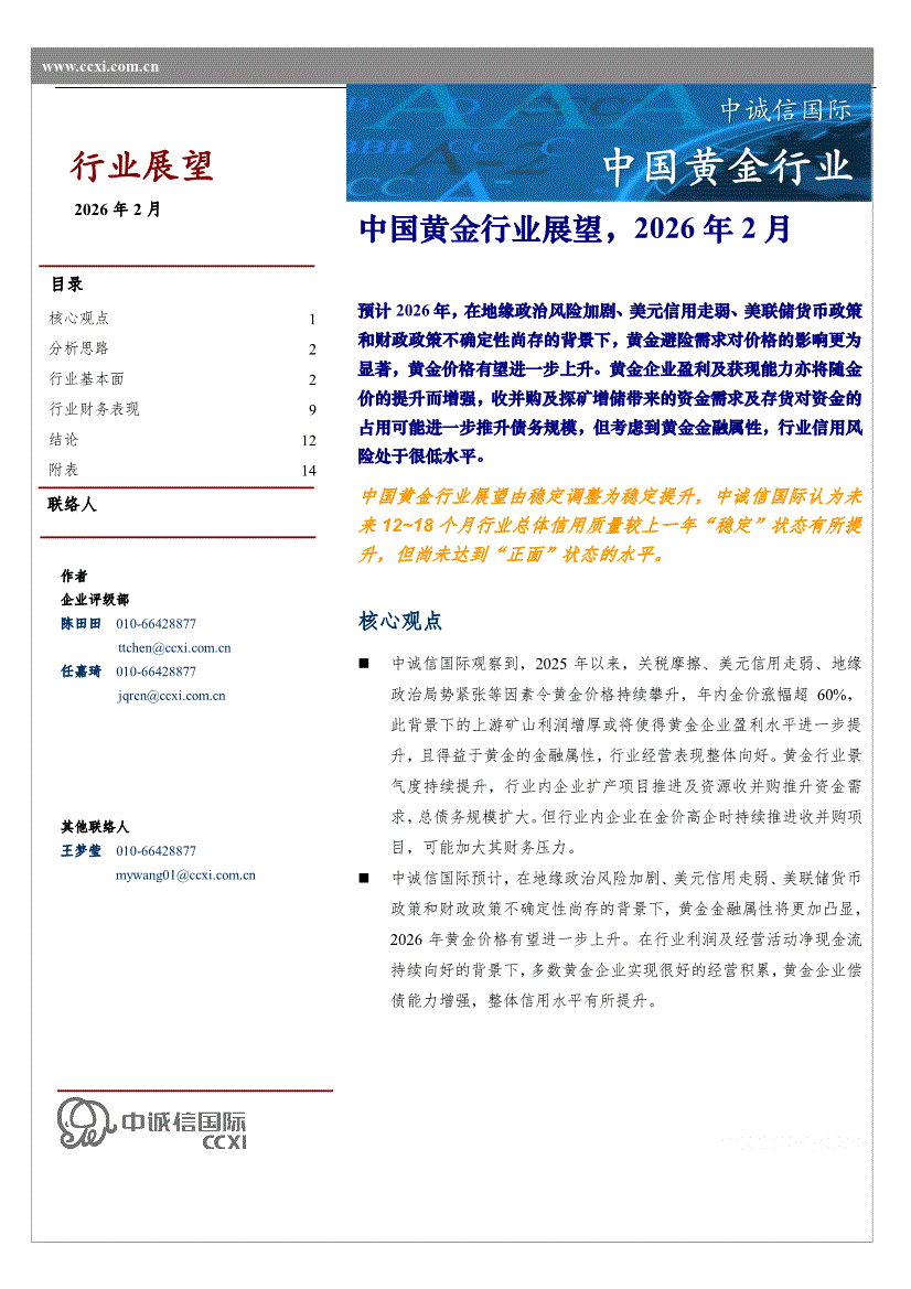 黄金行业:中诚信国际-中国黄金行业展望,2026年2月-260206
