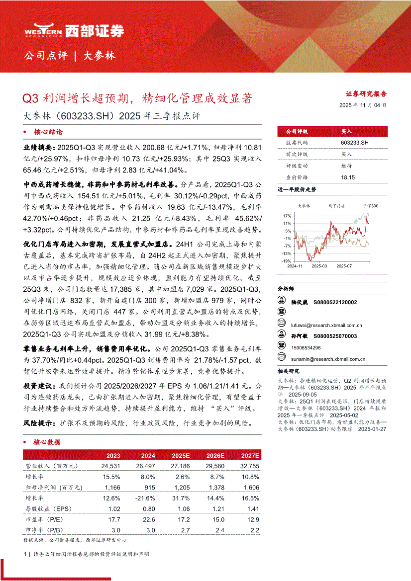 大参林:西部证券-大参林-603233-2025年三季报点评:Q3利润增长超预期,精细化管理成效显著-251104