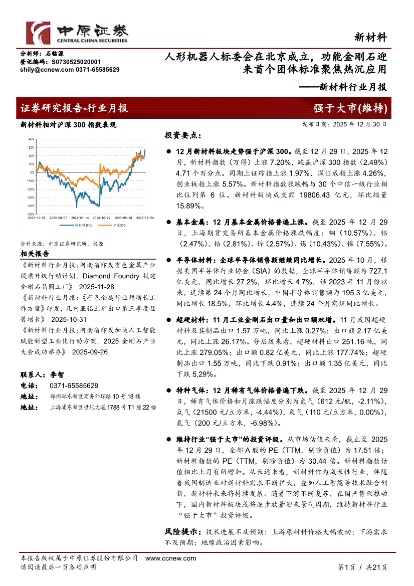新材料行业:中原证券-新材料行业月报:人形机器人标委会在北京成立,功能金刚石迎来首个团体标准聚焦热沉应用-251230
