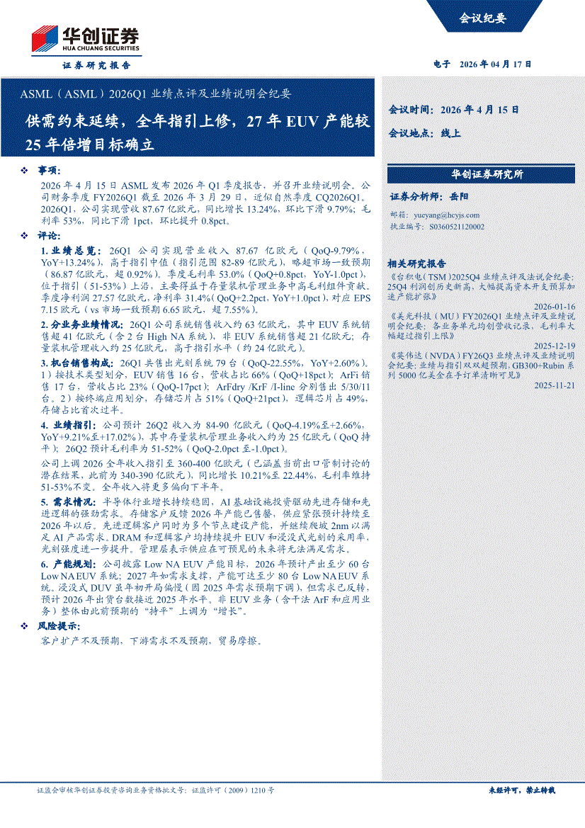 电子行业:华创证券-电子行业ASML(ASML)2026Q1业绩点评及业绩说明会纪要:供需约束延续,全年指引上修,27年EUV产能较25年倍增目标确立-260417