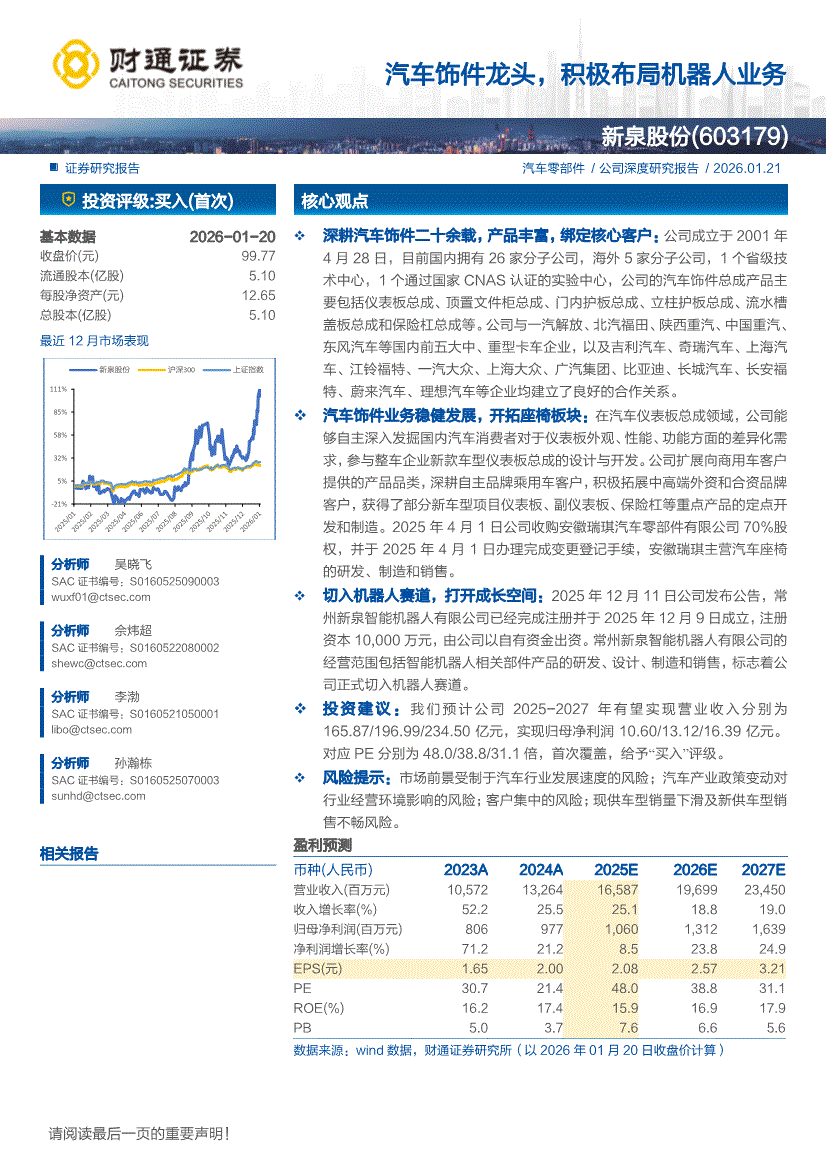 新泉股份:财通证券-新泉股份-603179-汽车饰件龙头,积极布局机器人业务-260121