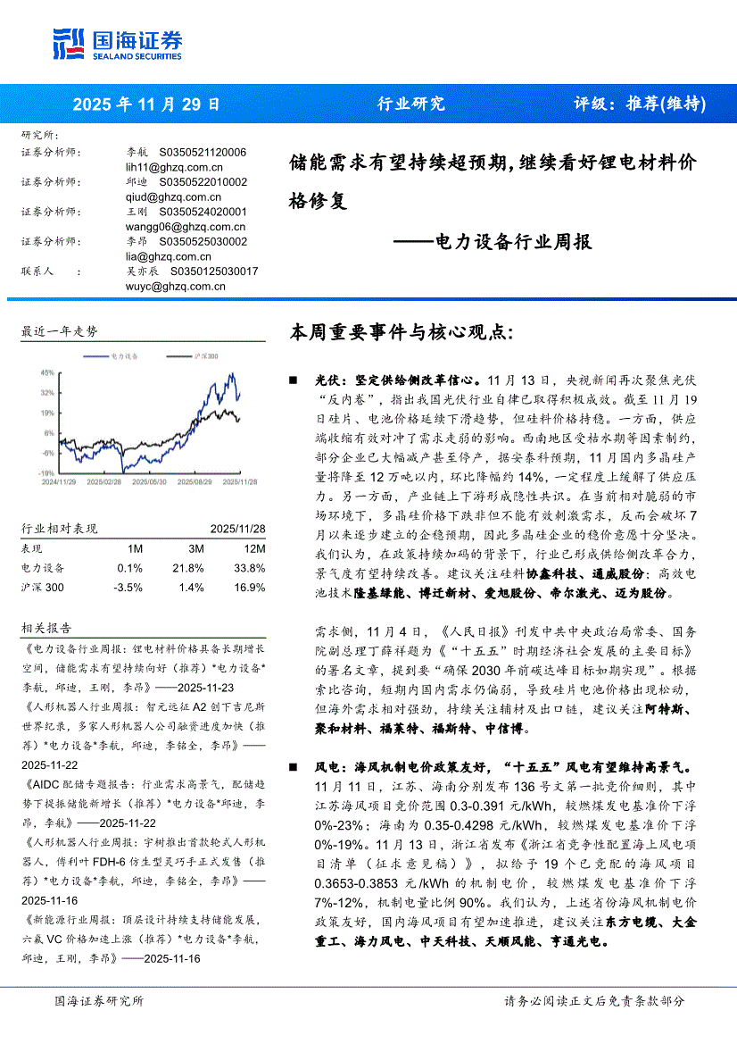 电力设备行业:国海证券-电力设备行业周报:储能需求有望持续超预期,继续看好锂电材料价格修复-251129