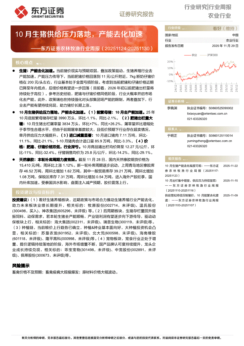 农林牧渔行业:东方证券-农林牧渔行业周报:10月生猪供给压力落地,产能去化加速-251129