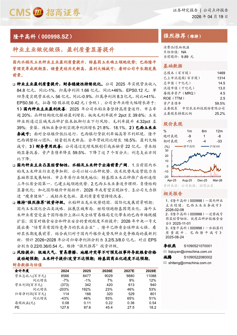 隆平高科:招商证券-隆平高科-000998-种业主业做优做强,盈利质量显著提升-260419