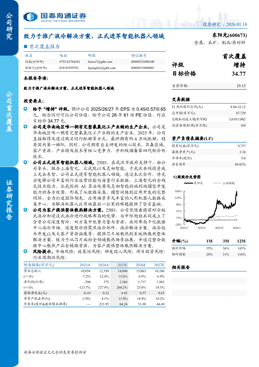 东阳光:国泰海通证券-东阳光-600673-首次覆盖报告:致力于推广液冷解决方案,正式进军智能机器人领域-260118