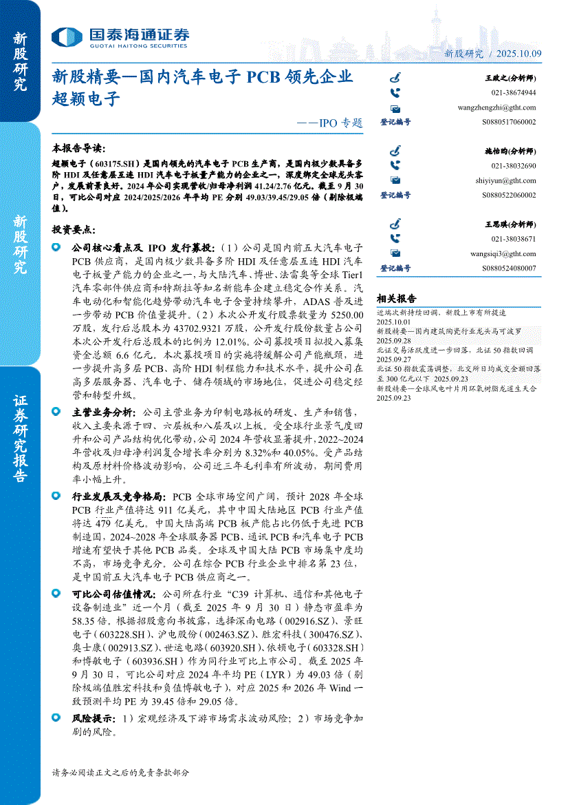 国泰海通证券-IPO专题:新股精要—国内汽车电子PCB领先企业超颖电子-251009