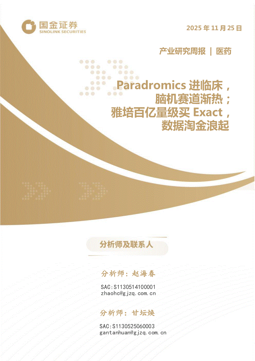 医药行业:国金证券-医药行业产业研究周报:Paradromics进临床,脑机赛道渐热;雅培百亿量级买Exact,数据淘金浪起-251125
