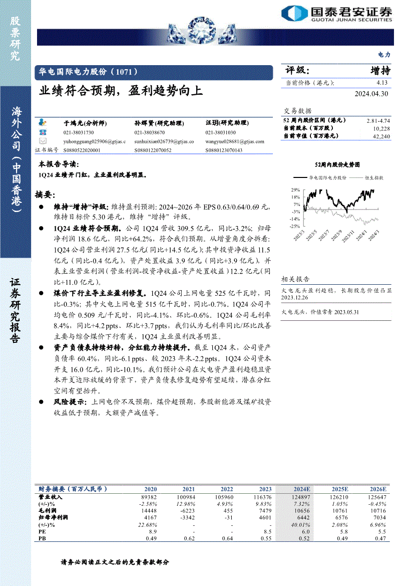 华电国际电力股份:国泰君安-华电国际电力股份-1071.HK-业绩符合预期,盈利趋势向上-240430