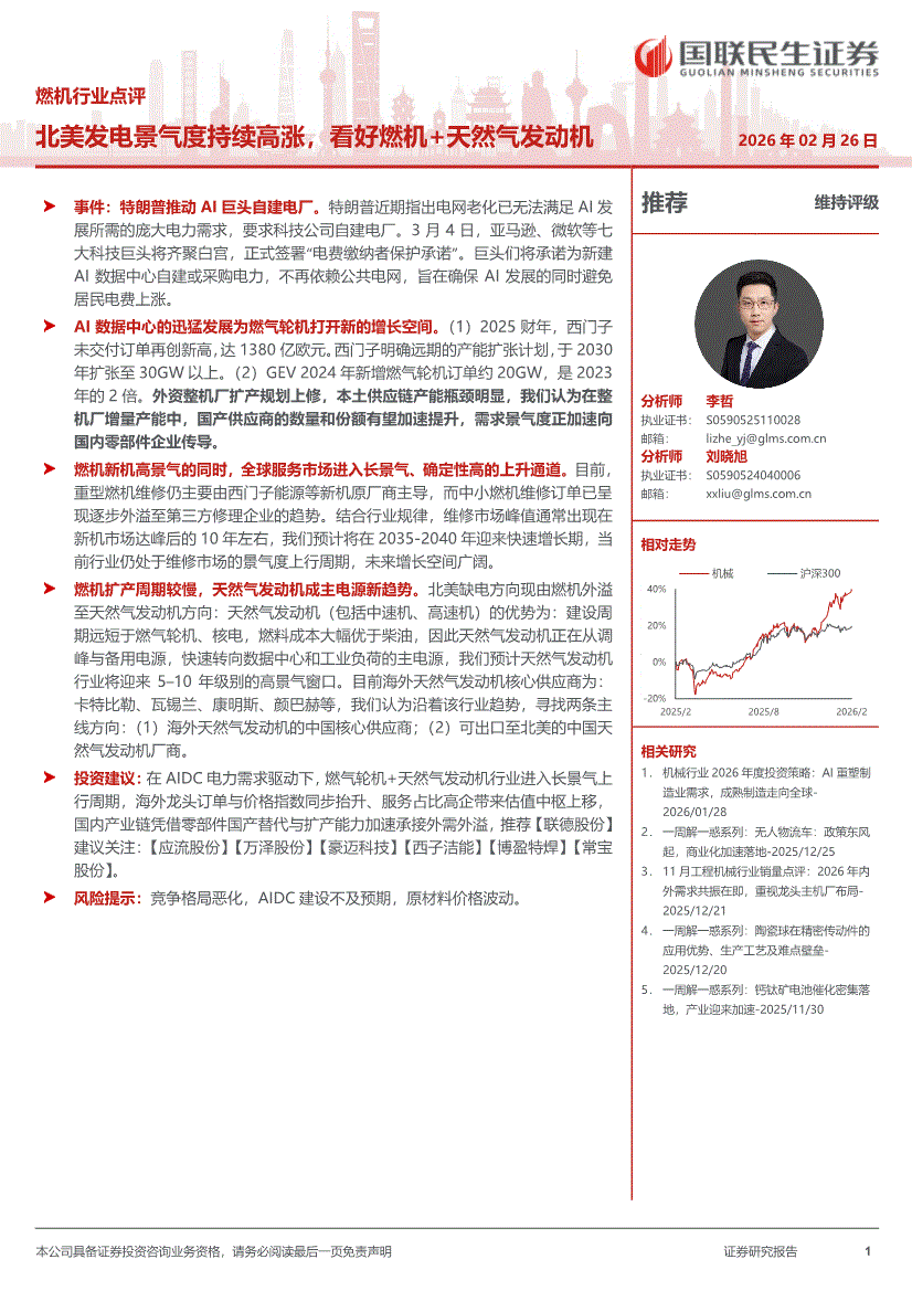 燃机行业:国联民生证券-燃机行业点评:北美发电景气度持续高涨,看好燃机+天然气发动机-260226