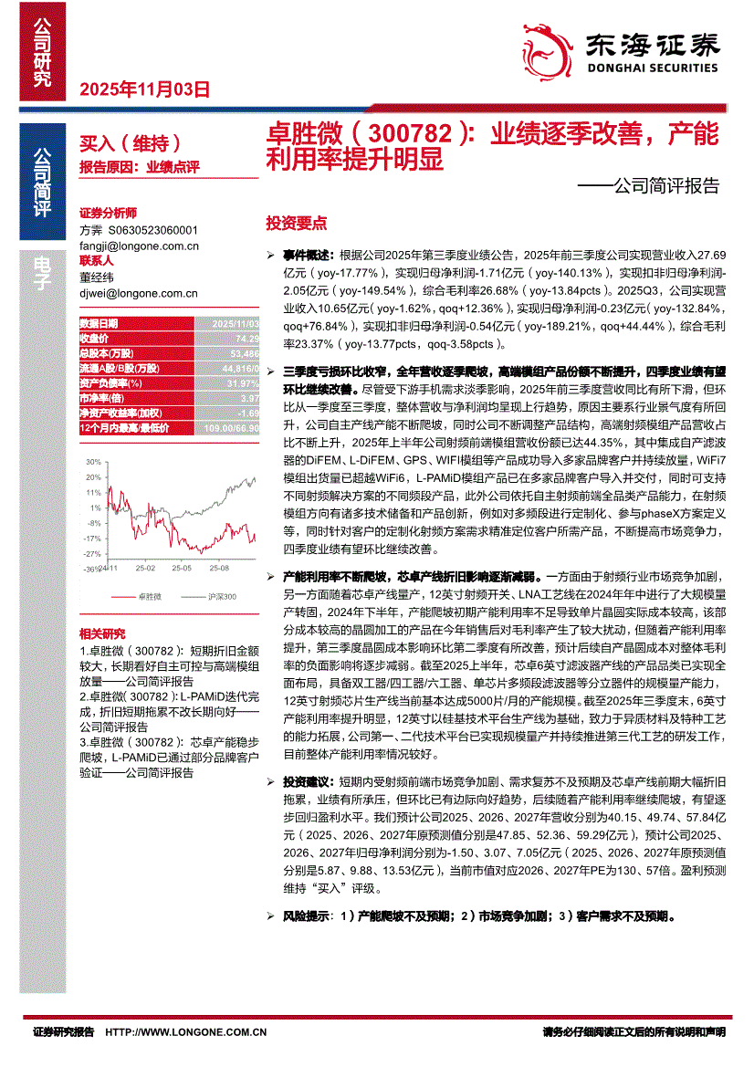 卓胜微:东海证券-卓胜微-300782-公司简评报告:业绩逐季改善,产能利用率提升明显-251103