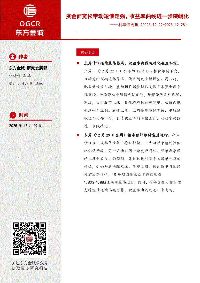 东方金诚-利率债周报:资金面宽松带动短债走强,收益率曲线进一步陡峭化-251229