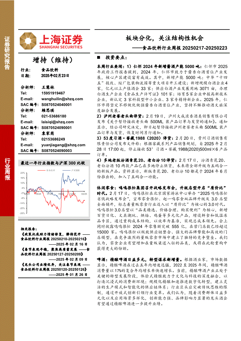 食品饮料行业:上海证券-食品饮料行业周报:板块分化,关注结构性机会-250223