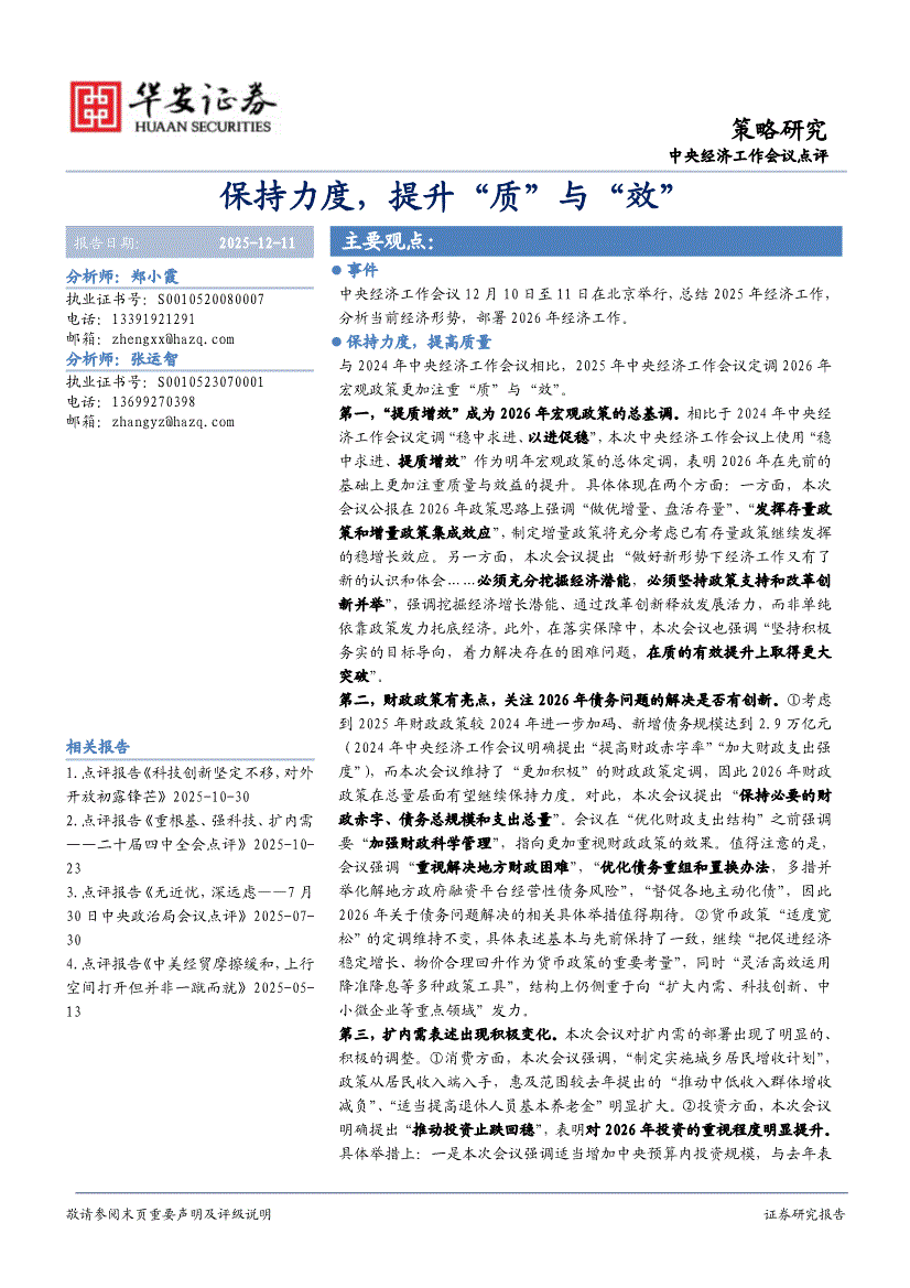 华安证券-中央经济工作会议点评:保持力度,提升“质”与“效”-251211