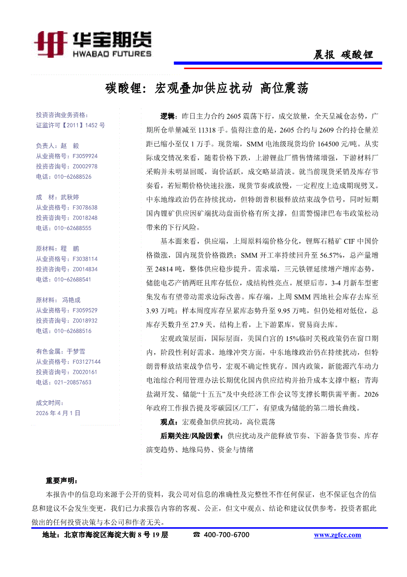 华宝期货-碳酸锂:宏观叠加供应扰动,高位震荡-260401