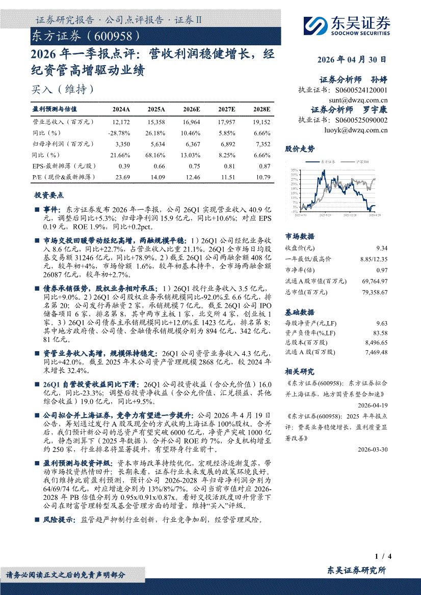 东方证券:东吴证券-东方证券-600958-2026年一季报点评:营收利润稳健增长,经纪资管高增驱动业绩-260430
